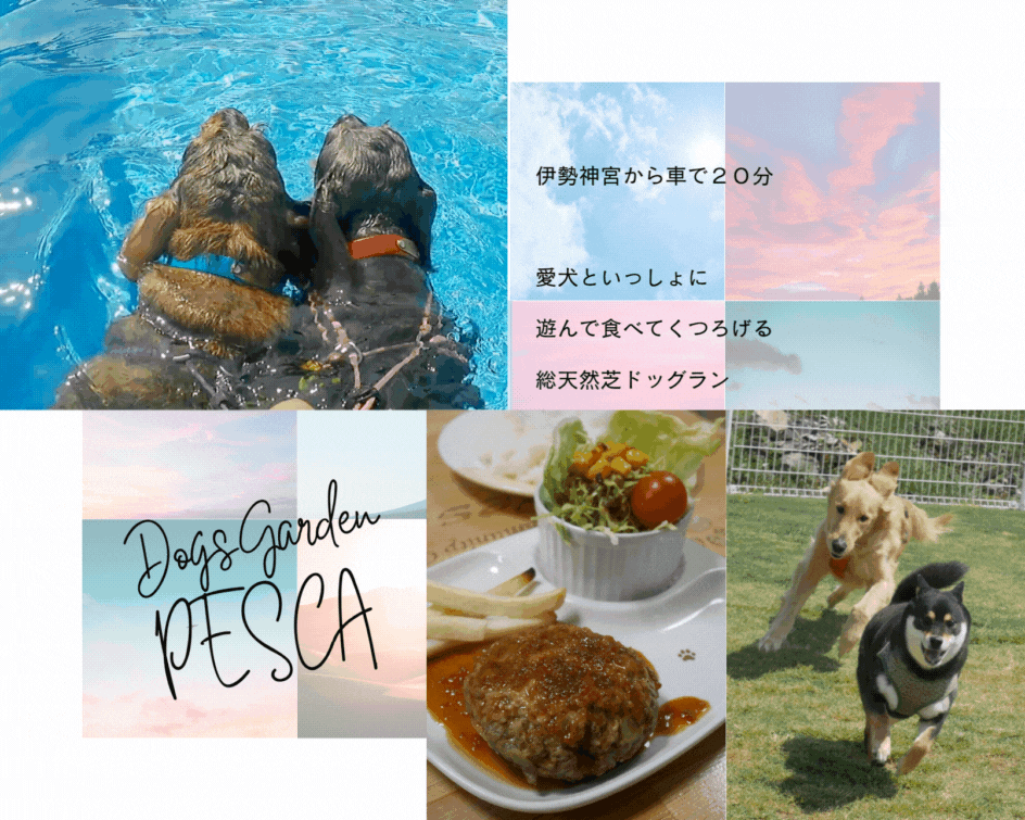 ドッグスガーデン ペスカは、「伊勢志摩国立公園の玄関口」「伊勢神宮のお膝元」とイメージされている三重県伊勢市に在り、国道23号沿線のとても交通の便が良く、田園風景の環境の良い地域にあるドッグラン・ドッグカフェ・ペットサロン・ドッグプールを併設するワンちゃん重視の施設です。